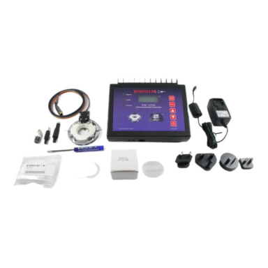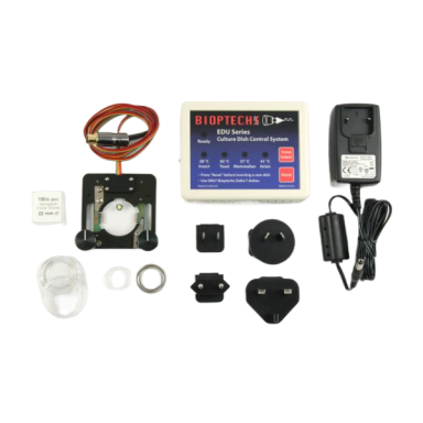 The Bioptechs Gas Humidifier warms water in a small containment vessel that the gas flows through creating a 100% RH atmosphere. The outflow of this gas is captured in the vessel, passed back through the heated base then close-coupled to the cell chamber thus preventing the RH from condensing before it reaches the cell chamber. If it is necessary to refill the water during an experiment, it has a Luer Slip refill cap so that water can be refilled with an ordinary syringe. It is safely powered by 12VDC and uses less than 2.5 watts. As a rule of thumb an unheated bubbler will only raise the RH around 10 to 15% above the inflow RH. However, a properly heated bubbler of the appropriate geometry will raise the inflow RH to 100%. It should also be appreciated that although you can produce 100% RH in a bottle or other device external to the cell containment structure it is necessary to prevent the air/gas flowing through the humidification device from condensing on its way to the cell chamber. Bioptechs addresses this problem by directly coupling the humidifier to the cell chamber thus providing a convenient, trouble free, and reliable solution. The Bioptechs Micro-Gas Humidifier along with a simple combination of a demand regulator and low flow peristaltic pump enables anyone to easily and cost effectively establish the proper gas and RH conditions for live cell microscopy.