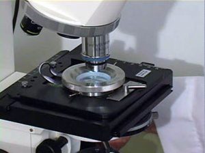 A black anodized aluminum plate containing a circuit board and electrical connectors that accepts the FCS3 and interfaces with the microscope stage. Select the adapter appropriate for your scope.
