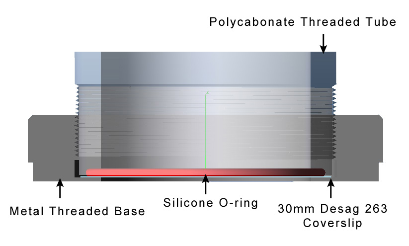 The Interchangeable Coverslip Dish has a silicone o-ring built into an autoclavable, polycarbonate tube to ensure a leak proof seal without having to over-tighten the cylinder. The polycarbonate tube design ensures that no metals will come in contact with the media. The dish will use 30mm diameter, #1.5 thickness, low alkaline, Desag 263 coverslips, optimized for cell culture growth. The base is made of stainless steel. The polycarbonate tube height can be anything from a minimum of 10mm to a maximum of 100mm. The standard height is 10mm. Therefore, it can be used as both an interchangeable coverslip dish or a settling chamber. The dish can be sterilized by an alcohol rinse or, if needed, the dish is fully autoclavable.