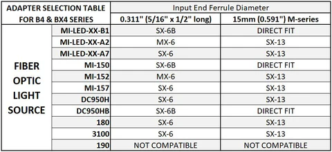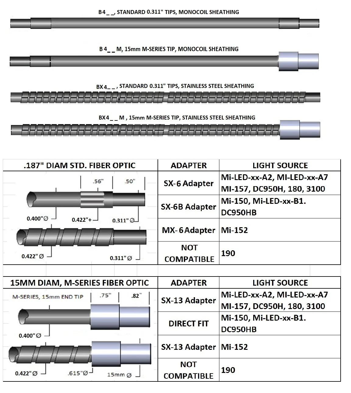 Flexible, single fiber optic light guide cable assemblies. B4 type have a PVC-Monocoil sheathing which is smooth and easy to clean. BR4 type fibers go through a secondary process to randomly distribute the fiber from end to end. This disperses hot and dark spot from the lamp and provides a more uniform light output.