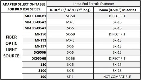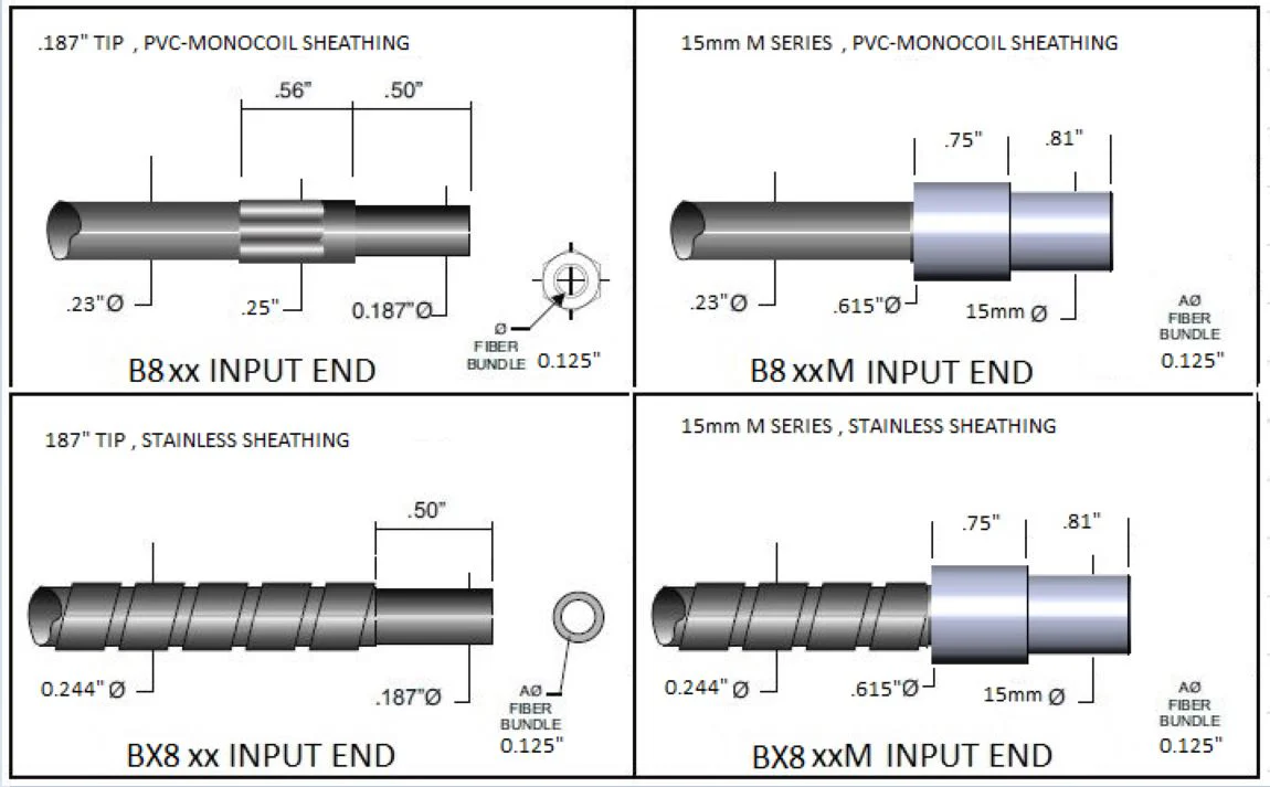 Flexible, single fiber optic light guide cable assemblies. B8 type have a PVC-Monocoil sheathing which is smooth and easy to clean. BX8 type have a flexible stainless steel sheathing that is super strong and will hold up to high temperature applications.