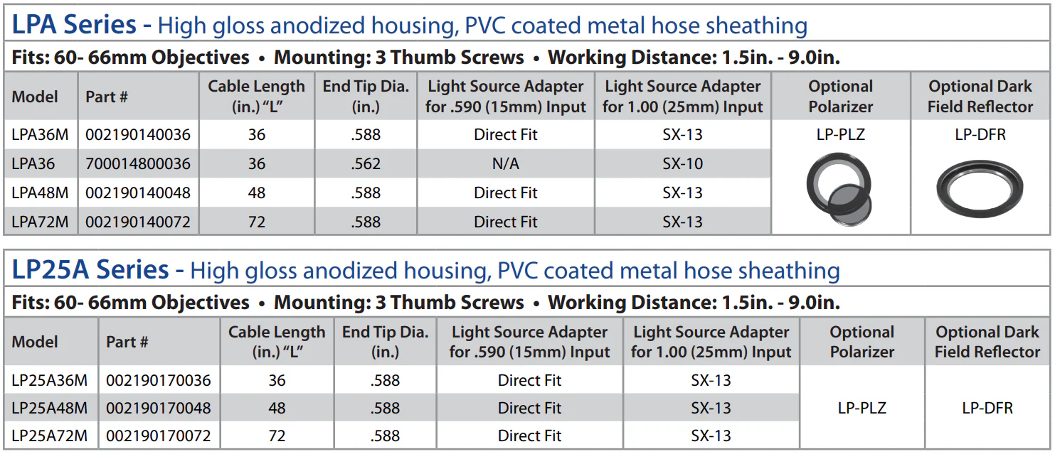 The LPA series fiber optic output is an annular configuration supplying 360 degrees of brilliant, oblique and even cross-illumination directed toward the optical axis at working distances from 1.5 to 9.0 inches (4-23cm). Fits objective lenses 60mm-66mm diameter. Fits the most common stereo microscope objective diameters of 2" (50.8mm) through 2.6" (66mm).