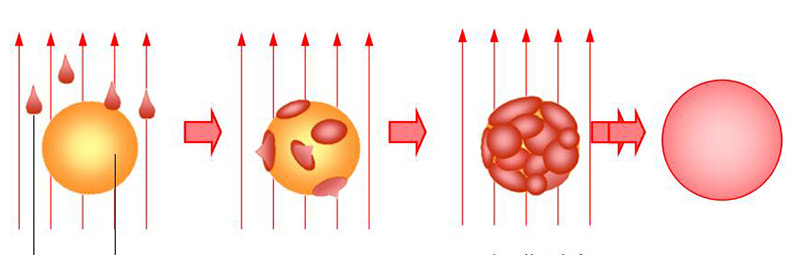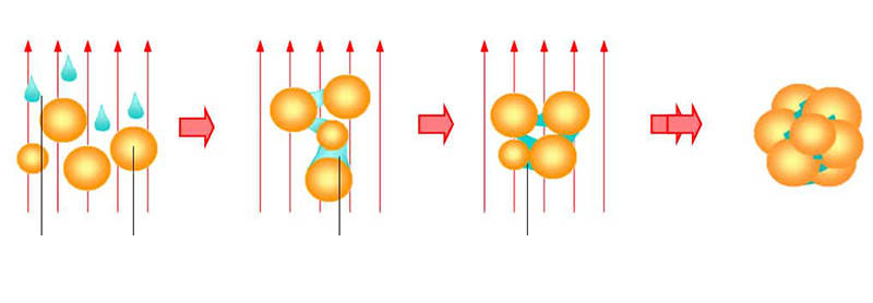 Spray agglomeration moves very small, powder particles in the fluidized bed where they are sprayed with a binder solution or suspension. Liquid bridges are created that form agglomerates from the particles. Spraying continues until the desired size of the agglomerates is reached.
