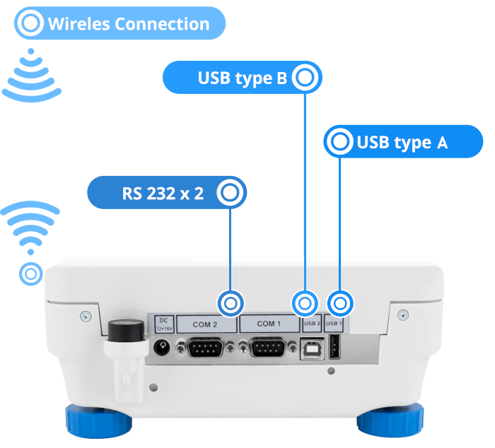 PS.R2 balances feature several communication interfaces: 2 x RS 232, type A USB, type B USB and optional Wireless Connection.