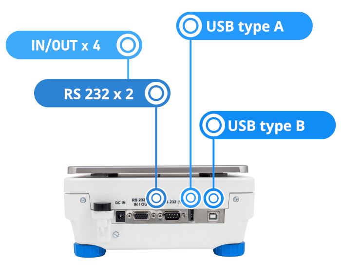 Printer, computer, flash drive or additional display – you can easily connect them thanks to the fact that the balance is equipped with interfaces: 2 x RS232, USB type A and USB type B. Optionally, the balance can be equipped with 4 IN and 4 OUT. You can find all accessories in our regular offer. And if you have questions about compatibility, our experts will help you.