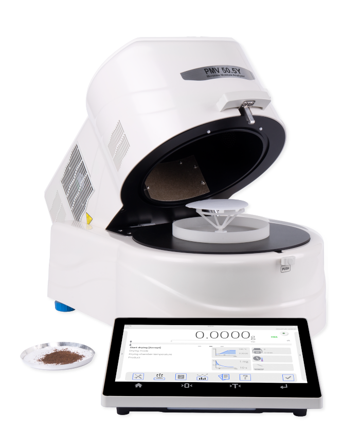 PMV 50.5Y moisture analyzer is an advanced solution for measurement of moisture content of samples containing significant amount of moisture (up to 100%). The drying process is carried out by means of microwaves which enable to evenly heat the whole sample’s volume. The PMV 50.5Y, when compared to standard moisture analyzers, significantly shortens the drying time.