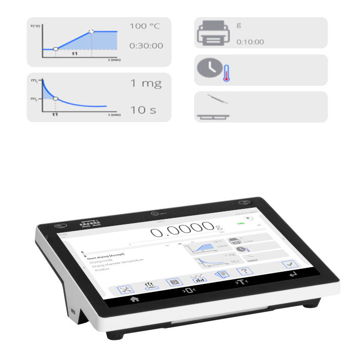 A respective drying program is selected depending on sample mass and its chemical composition. The average duration of this process depends on the type and mass of used substance, and takes 1 to 10 minutes. In contrast, drying using the traditional halogen moisture analyzer takes 5 to 40 minutes.